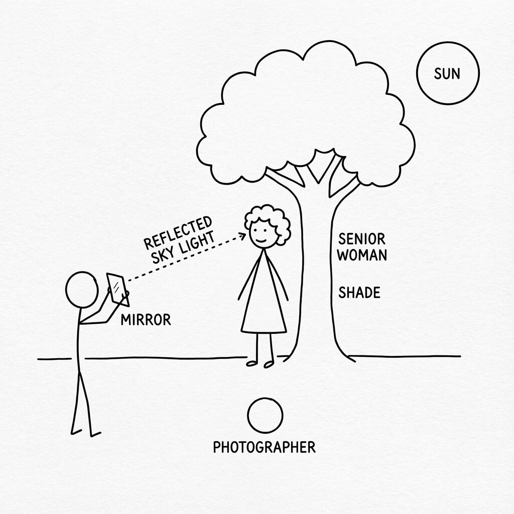 キャッチライト(瞳に映る小さな光)は、小さめの窓光か丸レフを「10時方向」に配置 ・レフ板はあご下ではなく「胸の上」に寝かせて、瞳孔に光を入れすぎない 小さく上品なキャッチが、シニアの目元をやさしく見せてくれます。